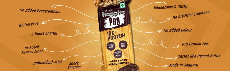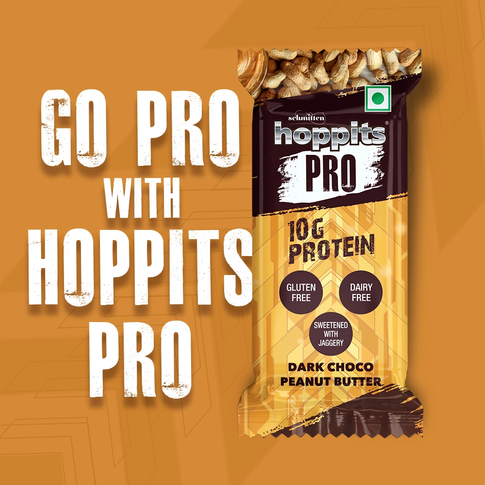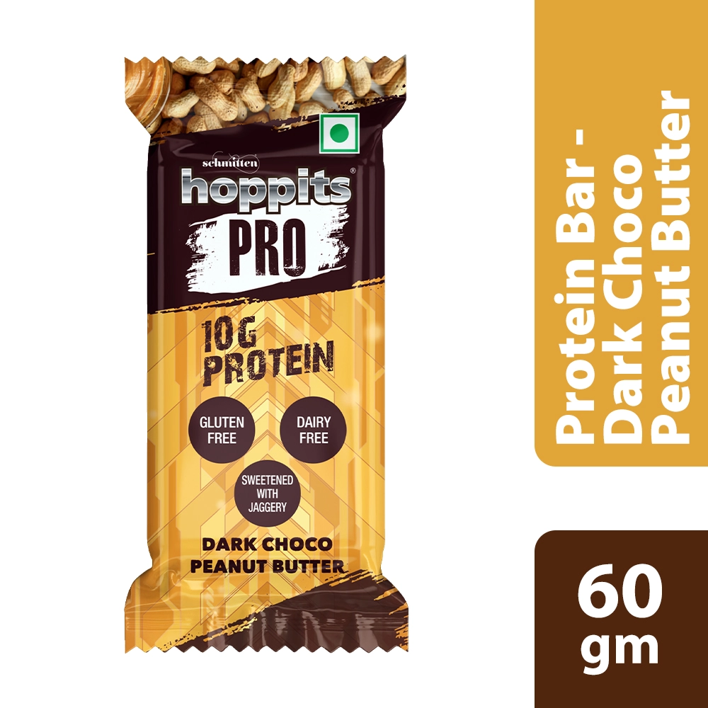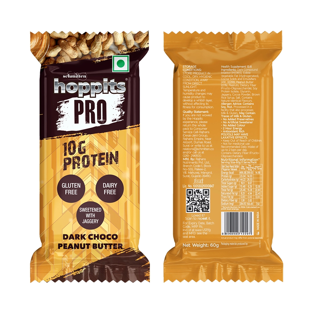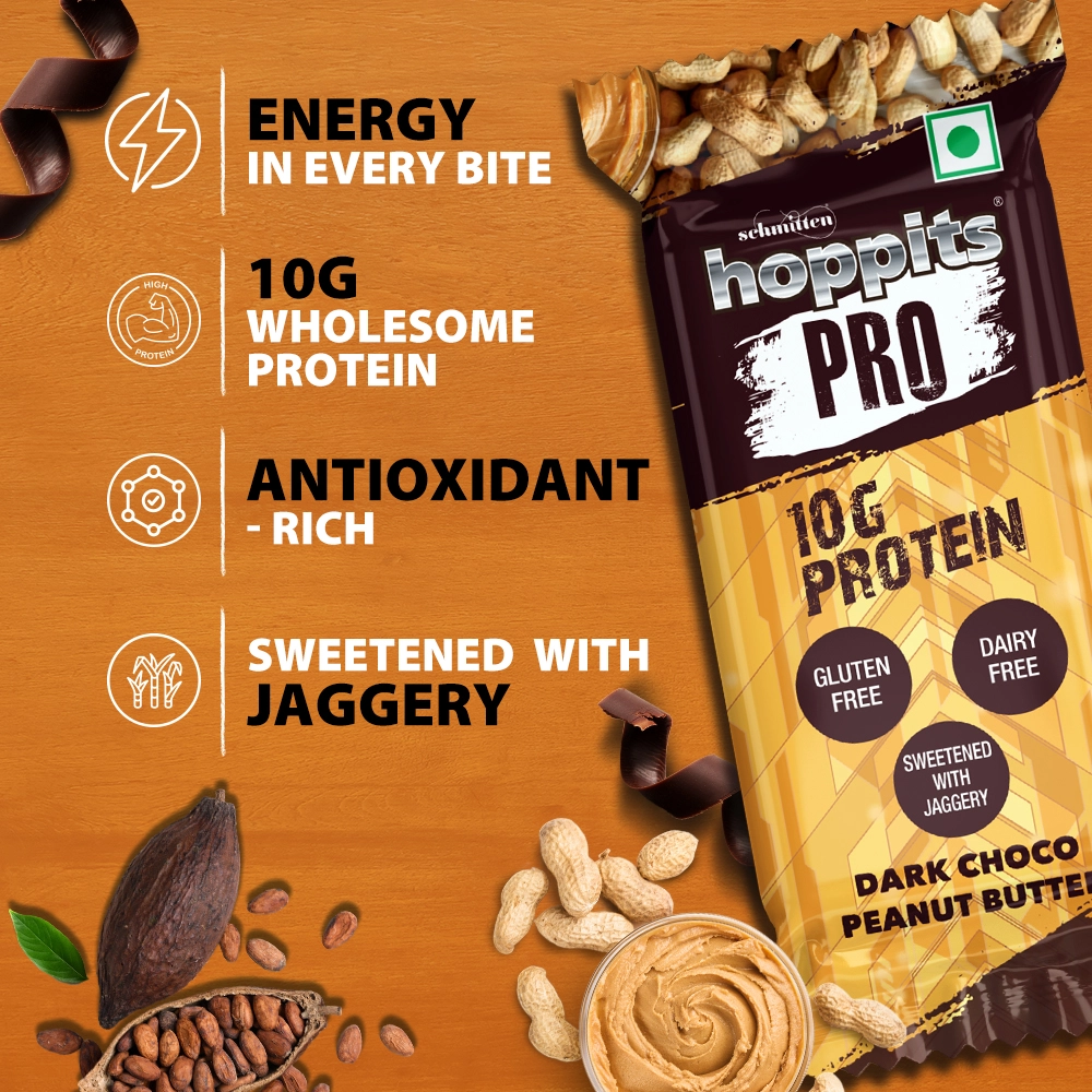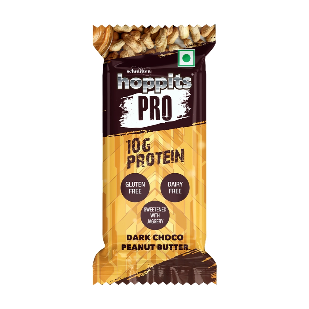 The Hoppits PRO Dark Choco Peanut Butter Bar brings together the bold richness of cocoa and the smooth decadence of roasted peanut butter in one unforgettable bite. Creamy, nutty, and soul-satisfying, this bar wraps you in comfort while delivering powerful fuel. Thoughtfully crafted with natural jaggery and wholesome, nutrient-rich ingredients, it ditches the refined sugar but keeps the lush, chocolatey indulgence intact. It’s your go-to bar for building strength, sustaining energy, and staying sharp from sunrise to sundown.