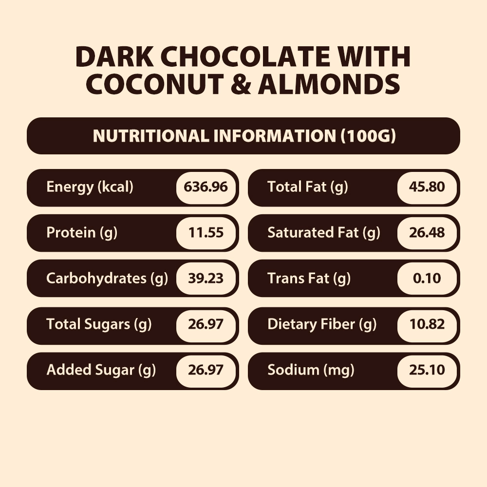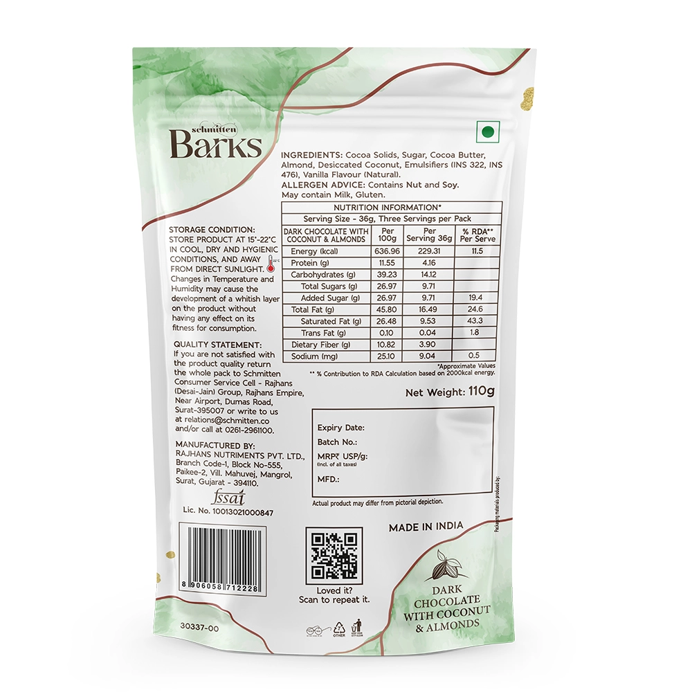 Bold meets blissful in this handcrafted creation from Schmitten Barks. Made with 70% premium dark chocolate sourced from Madagascar cocoa, this bark chocolate offers an intense, rich flavour that perfectly complements the satisfying crunch of almonds and the tropical sweetness of coconut. Expertly crafted using the traditional bark-making method, this treat is both gourmet and grab-and-go. The combination of roasted almonds and shredded coconut adds texture and balance, creating a unique chocolate experience for connoisseurs that’s nutty, smooth, and deeply satisfying.