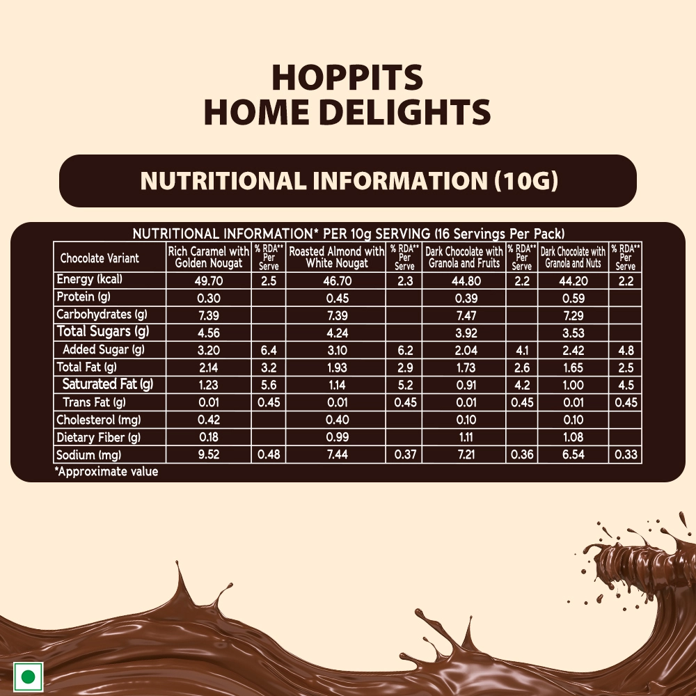 Bite into better with Hoppits Delight—a wholesome burst of goodness in every mouthful. This feel-good indulgence is a delicious blend of health and happiness. Each bite-sized bar is a compact marvel, blending crunchy nuts, luscious caramel, hearty oats, rich chocolate, and more. It’s the perfect harmony of taste and texture, created for those who crave nothing but the good taste. Thoughtfully packed and sealed for lasting freshness, these chocolately delights are your all-day pick-me-up—ideal for travel, work, workouts, or whenever hunger strikes.