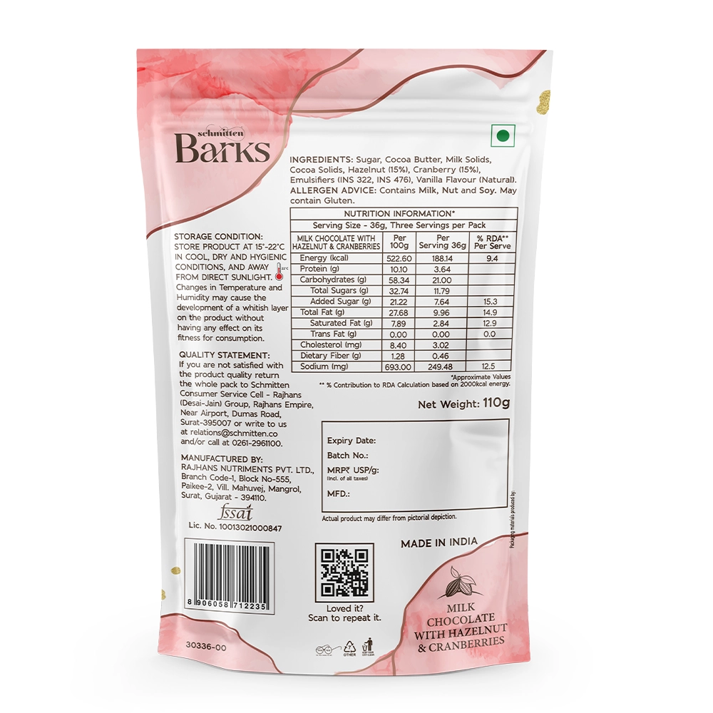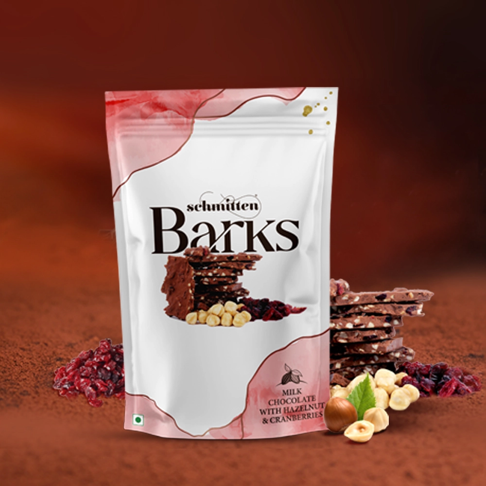 Experience the art of indulgence with Schmitten Barks—a handcrafted fusion of velvety milk chocolate, crunchy hazelnuts, and tangy cranberries. Expertly created through a traditional bark-making process—melting, blending, spreading, and setting chocolate into thin, snap-worthy pieces—this treat is as versatile as it is delicious. Each bark delivers a rich, satisfying bite that strikes the perfect balance between smooth, nutty, and fruity flavours. Whether you're enjoying a quiet coffee break, adding a gourmet twist to your yogurt bowl, or reaching for a sweet snack on the go, Schmitten Barks is your perfect companion for everyday indulgence.