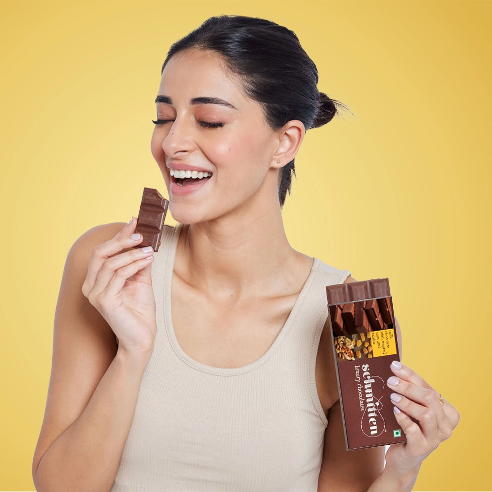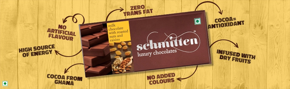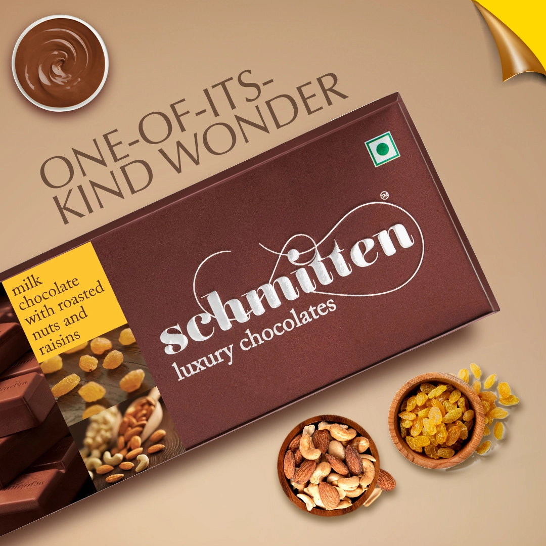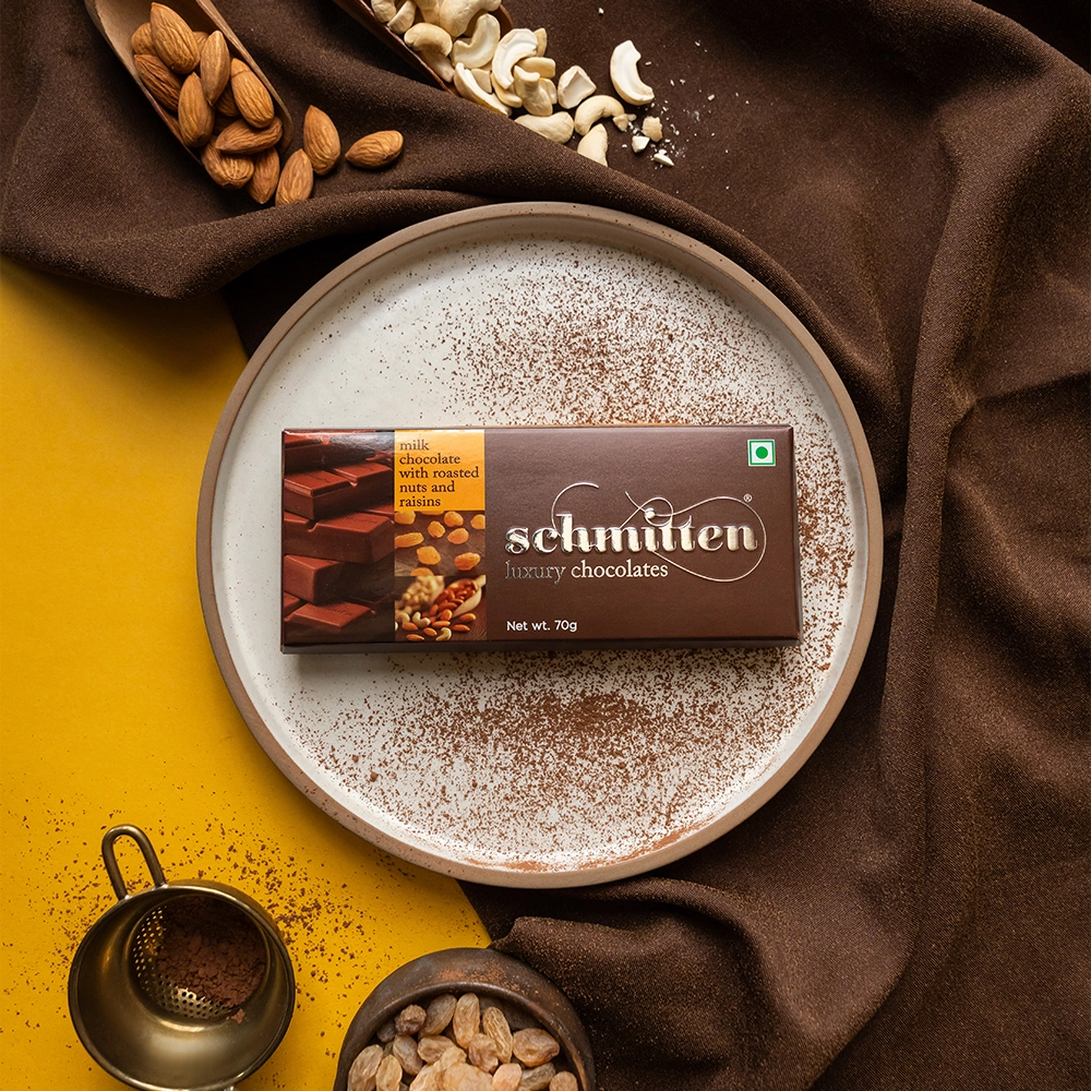 Dive into our Milk Chocolate with Roasted Nuts and Raisins—a chocolaty masterpiece where rich, velvety milk chocolate meets the crunch of perfectly roasted nuts and the burst of handpicked raisins. Crafted from premium Ghanaian cocoa, this chocolate is more than just a treat—it’s an experience. As the chocolate slowly melts, you’ll first catch the warm aroma of roasted almonds & chashew, followed by the chewy sweetness of sun-kissed raisins, all dancing in harmony with the creamy thrill of pure milk chocolate. Every bite is a moment of indulgence—crafted to international standards, free from artificial flavours, and packed for wholesome Mood.