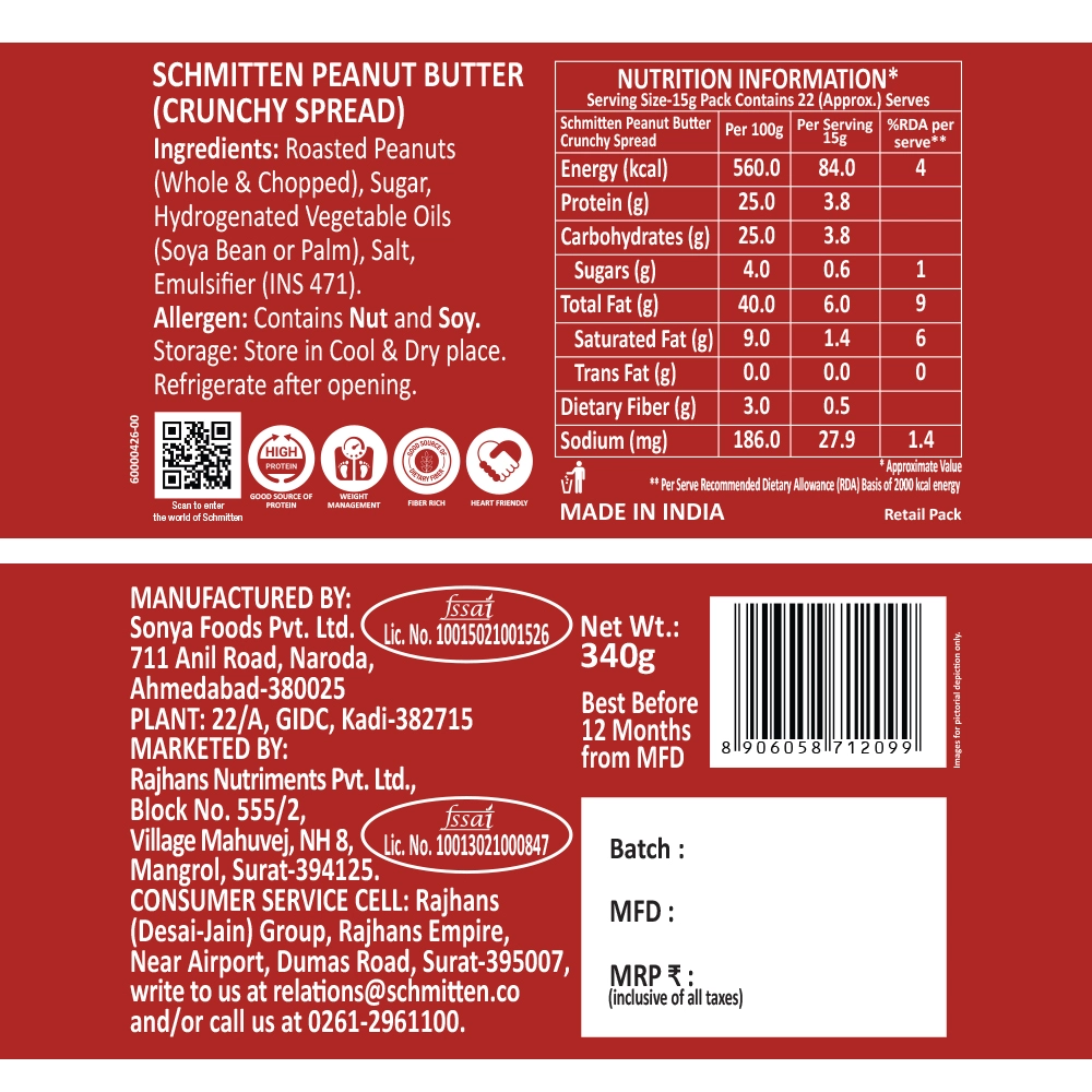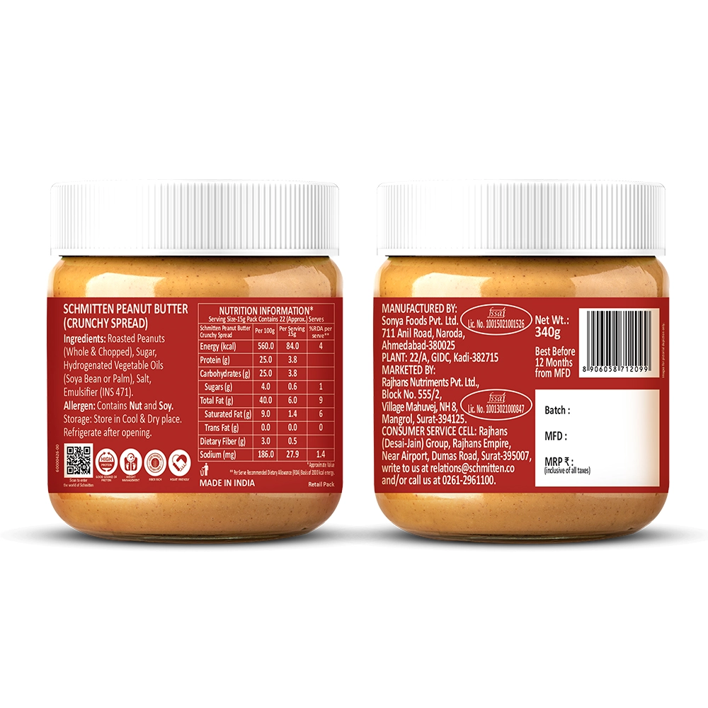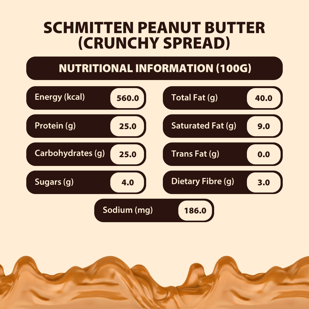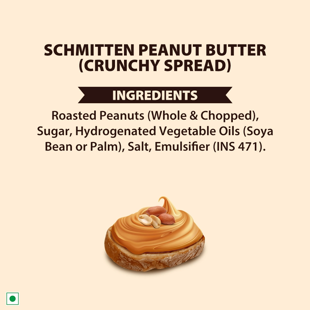 Get ready to bite into boldness with Schmitten Peanut Butter Crunchy Spread—where rich, roasted peanuts gives irresistible crunch. Packed with hearty peanut chunks, this spread delivers a rugged texture and a punch of nutty flavour along with the creamy paste that satisfies every time. It’s not just a spread—it’s an experience. Whether you’re powering through a busy day or fuelling up between meals, this makes the perfect on-the-go snack. From breakfast toast to energy bars and quick bites, it adds flavour, texture, and excitement to every bite.